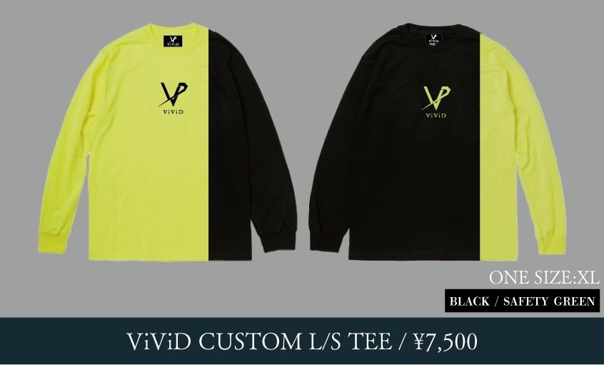 ViViDロゴを中央にあしらった黒とセーフティーグリーンの鮮やかなツートンカラーロングスリーブTシャツ